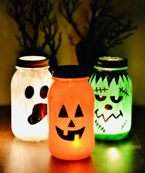 Har du tomme glass som du har spart på som for eksempel syltetøy eller annen mat kommer i? Da kan du enkelt lage dine egne lykter ved å male skumle ansikter på glassene! Plasser eller heng de små lyktene ute, eller bruk dem som dekorasjoner inne. Sett stearinlys oppi glassene for å få en skummel og lysende effekt ut fra det påmalte fjeset!
