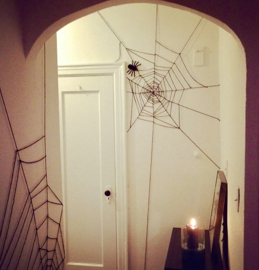 Spindelvev ut av svart snor – dette kan du faktisk enkelt lage selv! Alt som kreves er en svart snor – deretter er det kun fantasien som setter grenser for hvor stort edderkoppnettet ditt skal være. Snoren kan brukes både innendørs og utendørs, og for ekstra effekt kan man feste noen skumle edderkopper i spindelvevet – disse kan du enten lage selv, eller kjøpe i butikken.