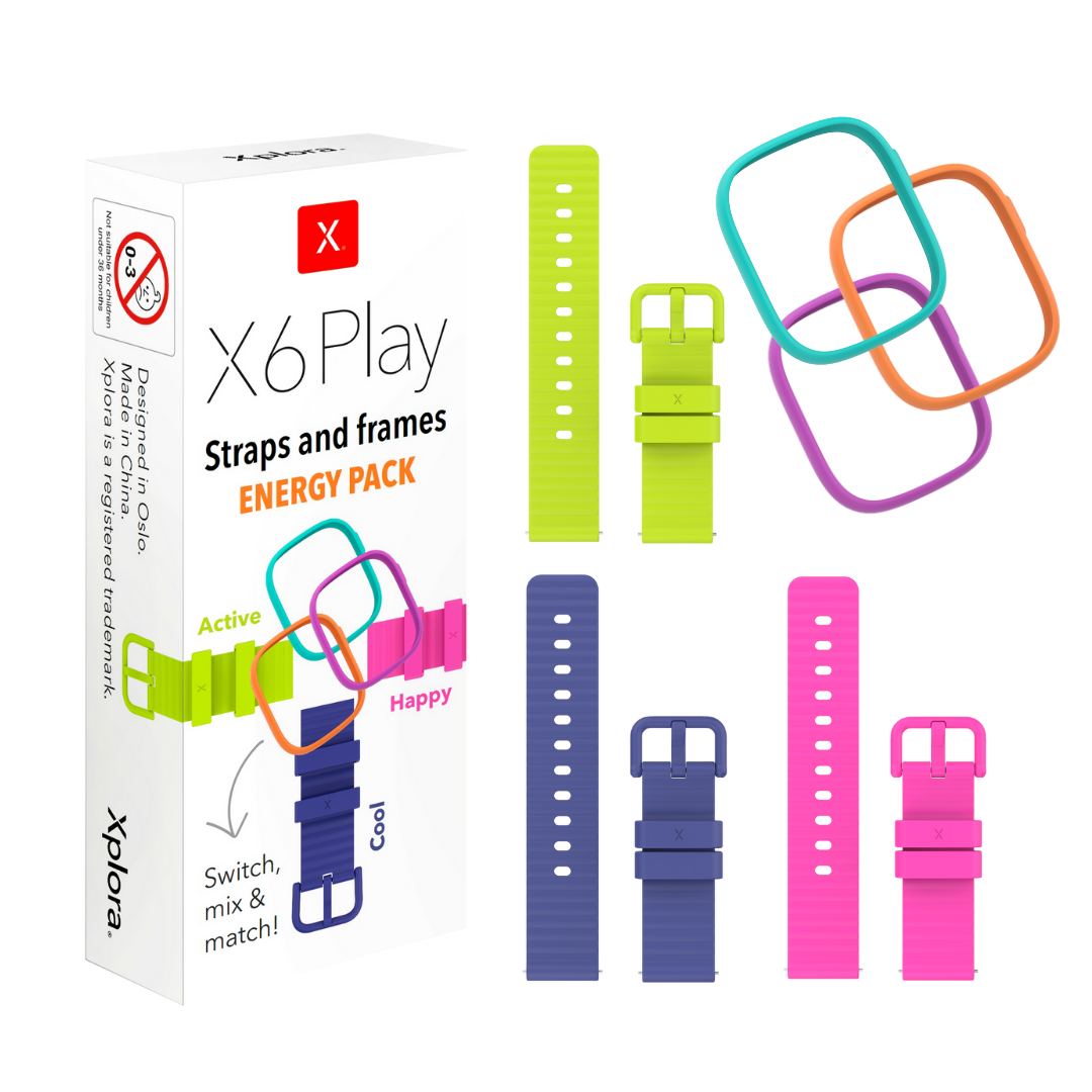La barna raskt tilpasse utseende på sin Xplora-smartklokke med Xplora X6Play Energy Pack klokkereimer. Pakken med tre klokkereimer og tre rammedeksler gjør at de kan leke seg med en rekke fargekombinasjoner. La barna mikse og bytte fargekombinasjoner for å gjøre sin smartklokke enda mer personlig.